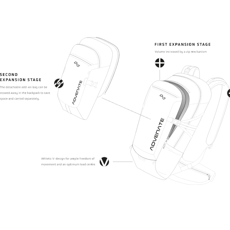 Der Advenate rucksack Symphony Symphony 25+4+6 Der Allrounder ist ein vielseitiger, technischer Tagesrucksack mit Top-Ausstattung und daher ideal für Tagestouren, die eher einer vollwertigen Tour gleichen. Mit bis zu 10 Litern Zusatzvolumen und dem 2-stufigen Erweiterungssystem können Sie die Größe flexibel an Ihre Bedürfnisse anpassen. Das einzigartige Erweiterungssystem (zum Patent angemeldet) verleiht dem Symphony eine ganz neue Bedeutung für Flexibilität in Rucksäcken. Mit diesem Rucksack haben Sie zwei verschiedene Größen in nur einem Rucksack. Nachfolgend finden Sie die Spezifikationen der Symphonie 25+4+6: -Innovatives 2-stufiges Expansionssystem (zum Patent angemeldetes DE 102020 122 461.3) -Schlüsselclip -Anatomisch geformte und perforierte Schultergurte aus ultraleichtem Airmesh -Trinkclip -Auslass für Trinksystem -Verstaubarer Helmhalter für XC- und Integralhelme -Abnehmbare Werkzeugtasche und abnehmbarer Packsack (zweite Volumenerweiterung) -Komfortables und ergonomisches Ergovent-Rückensystem mit belüftetem Netzrücken -SOS-Druck mit Sicherheitshinweisen -Taschenlampenhalter und Reflektoren am Rucksack und Regenschutz -Schnellzugriffsfach an der Rückseite -Hinteres Fach für schnellen Zugriff auf ein Mobiltelefon -Gepolsterter Hüftgurt mit Tasche -Schlaufe für Brille am Schultergurt -Flexible Lycra-Seitentaschen mit schnellem Zugriff -1280 Gramm -Abmessungen: 54 x 30 x 30 cm -100% Baumwolle -Separates Fach mit Fleecefutter für Sonnenbrillen -Seitliche Kompressionsriemen -Helle Farben auf der Innenseite, um die Ausrüstung leichter zu finden -Stufenlos verstellbarer Brustgurt mit Notfallpfeife -Integrierter Regenschutz -Athletisches V-Design für ausreichend Bewegungsfreiheit und optimale Lastverteilung Das Ergovent-Rückensystem ist mit vorgeformten aufgerauten Schaumstoffprofilen und Air-Mesh-Polstern an Rücken und Hüftgurt ausgestattet. Da Sie minimalen Kontakt mit Ihrem Rücken haben, garantiert dies maximale Belüftung. Die seitlichen Aussparungen und der vertikale Belüfter sorgen für eine konstante und freie Luftzirkulation. Die perforierten Air-Mesh-Schultergurte sind anatomisch geformt, um optimale Atmungsaktivität und höchsten Tragekomfort zu gewährleisten. Ein perfektes Modell mit dem Spitznamen ‚Das Packpferd‘ für Tagesausflüge, die eher zu einer vollwertigen Tour werden Mit insgesamt 10 Litern zusätzlichem Volumen können Sie die Rucksack verwenden Sie es sogar für längere Reisen mit mehr Ausrüstung.