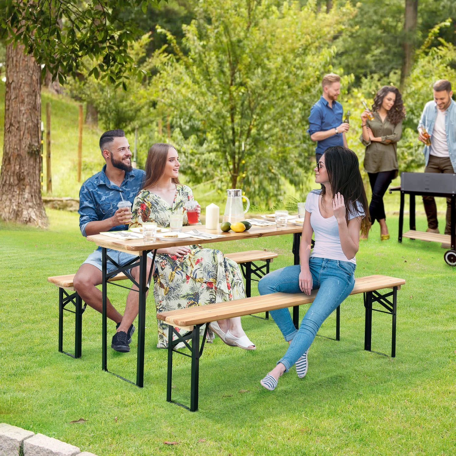Die 3-teilige Bierzeltgarnitur Bichl 170 cm ist ein echtes Allroundmöbel für den Außenbereich. Ob Geburtstagsfeier im Garten, Grillparty auf der Terrasse oder beim Camping – die Sitzgarnitur aus Biertisch und 2 Bierbänken ist schnell aufgebaut und lädt zum gemütlichen Zusammensitzen ein. Die stabilen Metallgestelle verleihen dem Gartenmöbel-Set einen stabilen Stand. Dank der Scharniere klappen Sie die Gestelle nach der Party schnell wieder ein, sodass Sie die Biertischgarnitur platzsparend verstauen können. Die lackierten Oberflächen aus Tannenholz sind überaus robust und lassen sich leicht wieder reinigen.