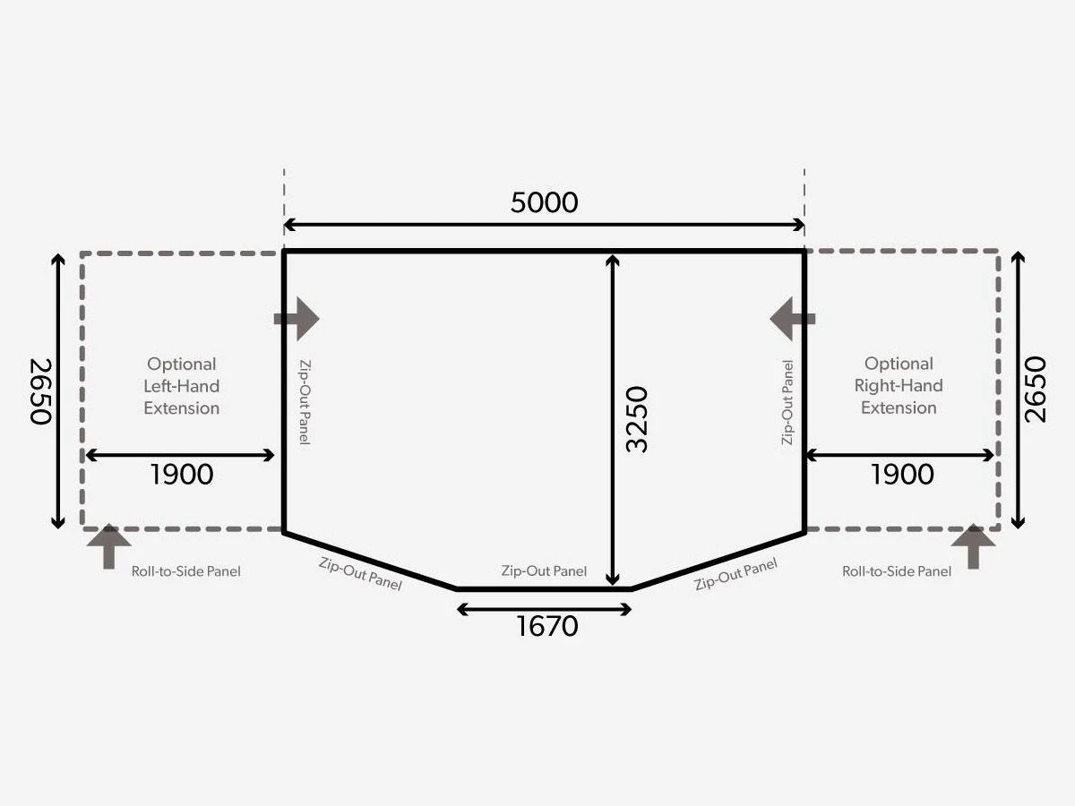 Das Vorzelt ist 500 cm breit. Das bedeutet, dass Ihr Wohnwagen über eine gerade Schiene von mindestens 500 cm verfügen muss, um das Vorzelt aufstellen zu können. Sie möchten das Vorzelt in die Schiene Ihrer Markise schieben? Dann muss die Markise mindestens 500 cm lang sein.