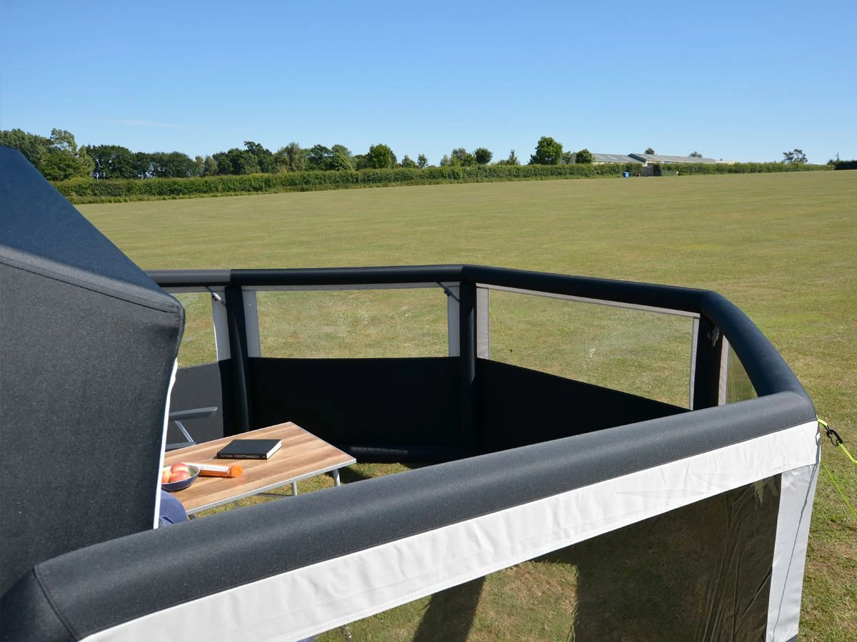 Eine weitere Besonderheit ist, dass der Air Break Pro an die Vorderseite an Dometic Vorzelte gekoppelt werden kann. Dadurch entsteht eine eingezäunte Terrasse für zusätzliche Privatsphäre. Ein weiterer großer Vorteil ist, dass die Umzäunung dafür sorgt, dass Ihr Hund nicht weglaufen kann.
