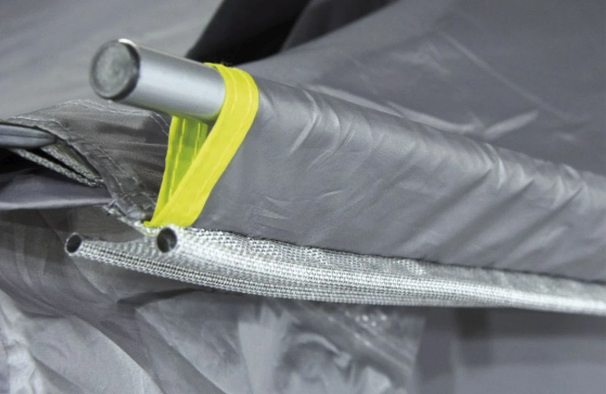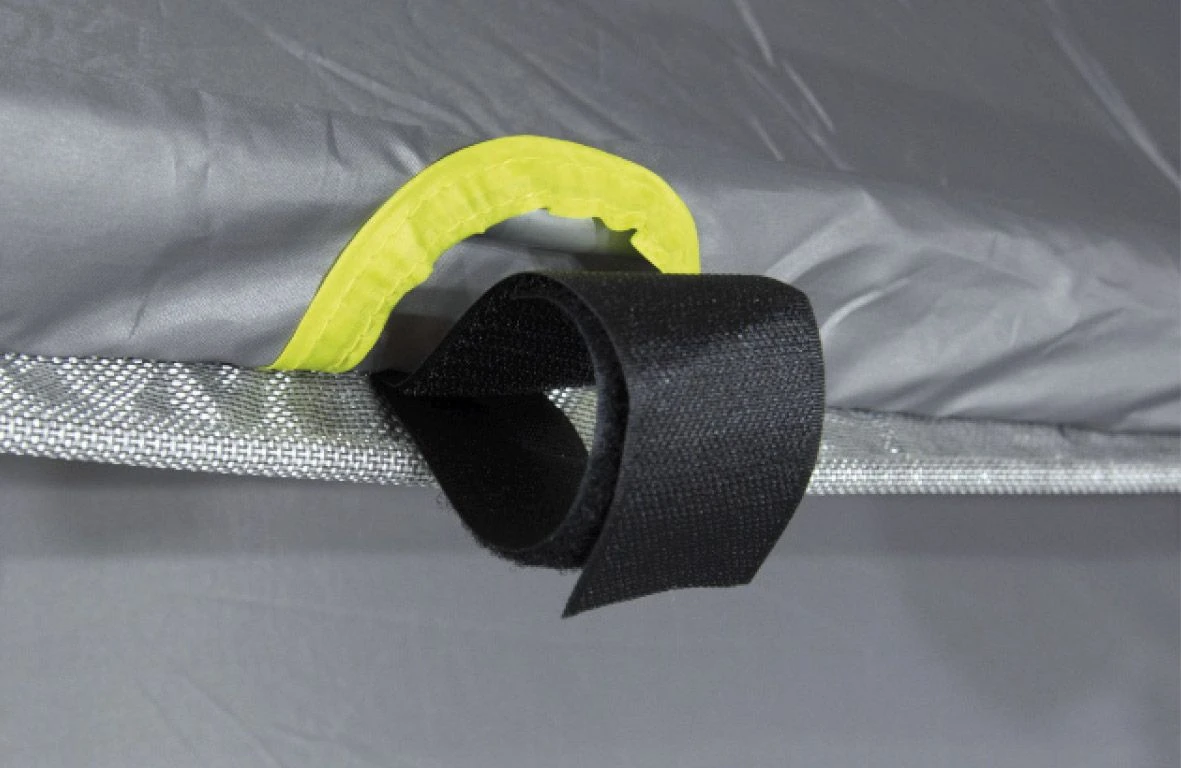 Extra robuste Reißverschlüsse mit Regen-Abdeckung gegen Feuchtigkeit. 4 Neon gelbe verstellbare Sturmbänder und Abspannleinen sind in der Dämmerung gut sichtbar. Kabeleingang mittels Reißverschluss und Kabelführung für Beleuchtung.