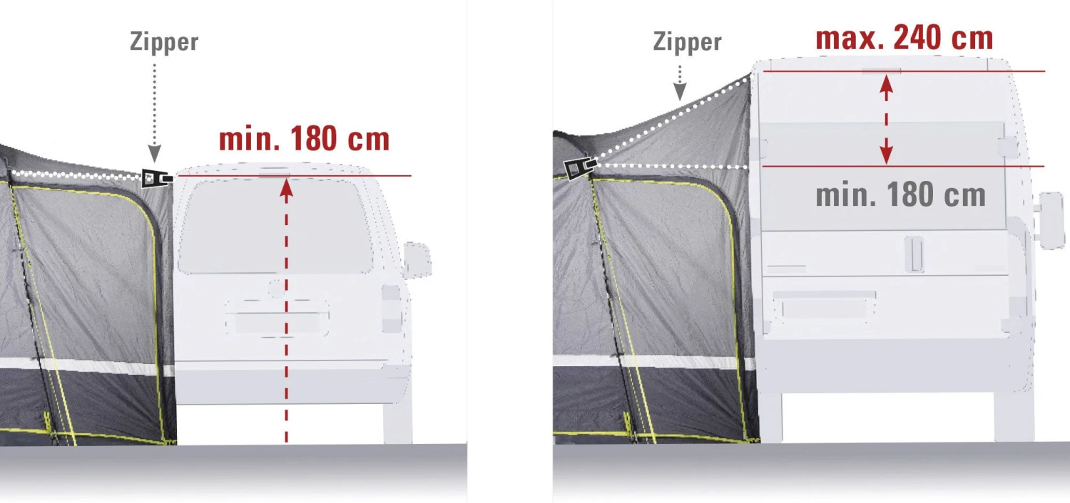 Die Schleuse hat eine Dach- Befestigungslänge von 245 cm und eine verstellbare Anbauhöhe von 180-240 cm mittels Reißverschluss und verstellbarem Gurtband. 2 Schleusentüren ermöglichen Zugang zum Fahrzeug.