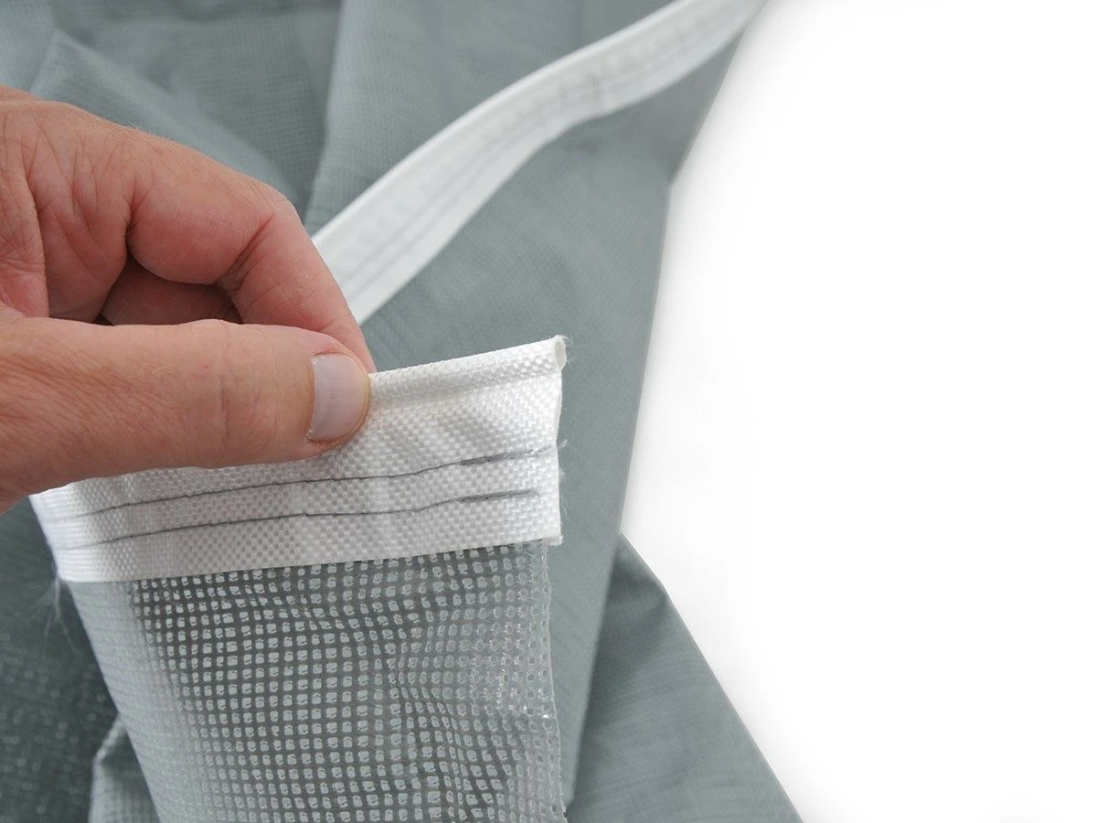 Die Sol Front Xl hat an der Oberseite einen Keder, den Sie einfach in die Schiene der Thule Omnistor, Fiamma, Dometic Prostor oder Obelink Markise schieben. Mit den mitgelieferten Spannleinen spannen Sie die Obelink Sol Front XL schnell und einfach ab. So sind Sie vor Sonne und Wärme geschützt, können aber trotzdem von der Aussicht genießen.