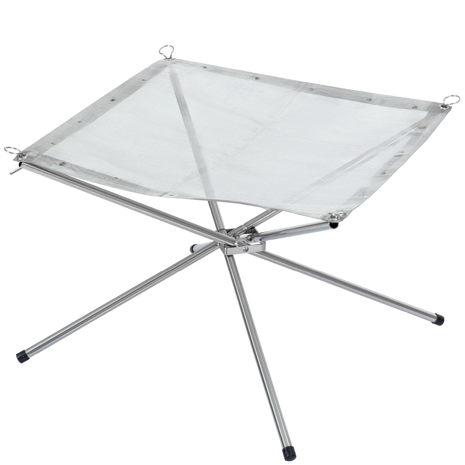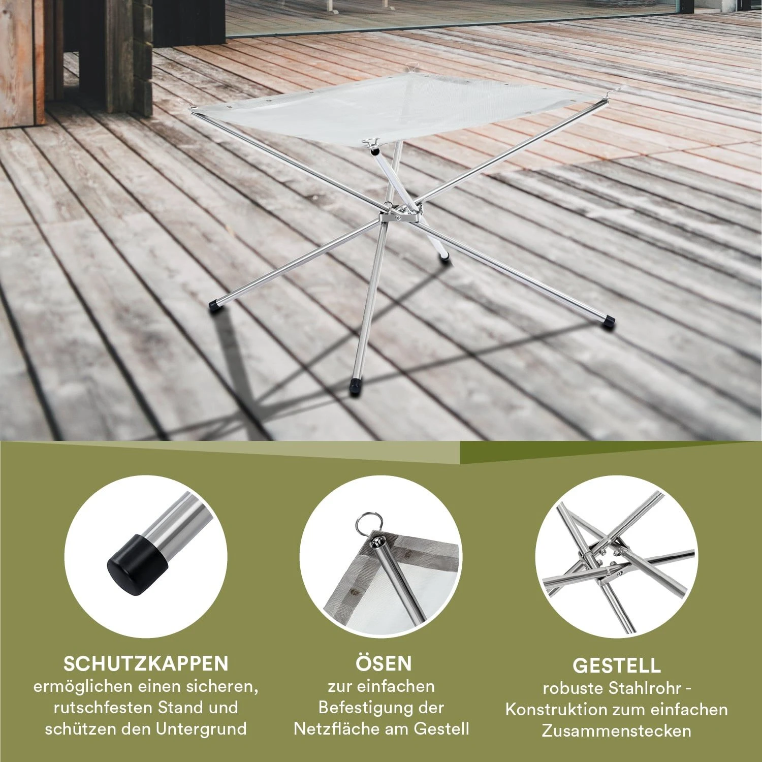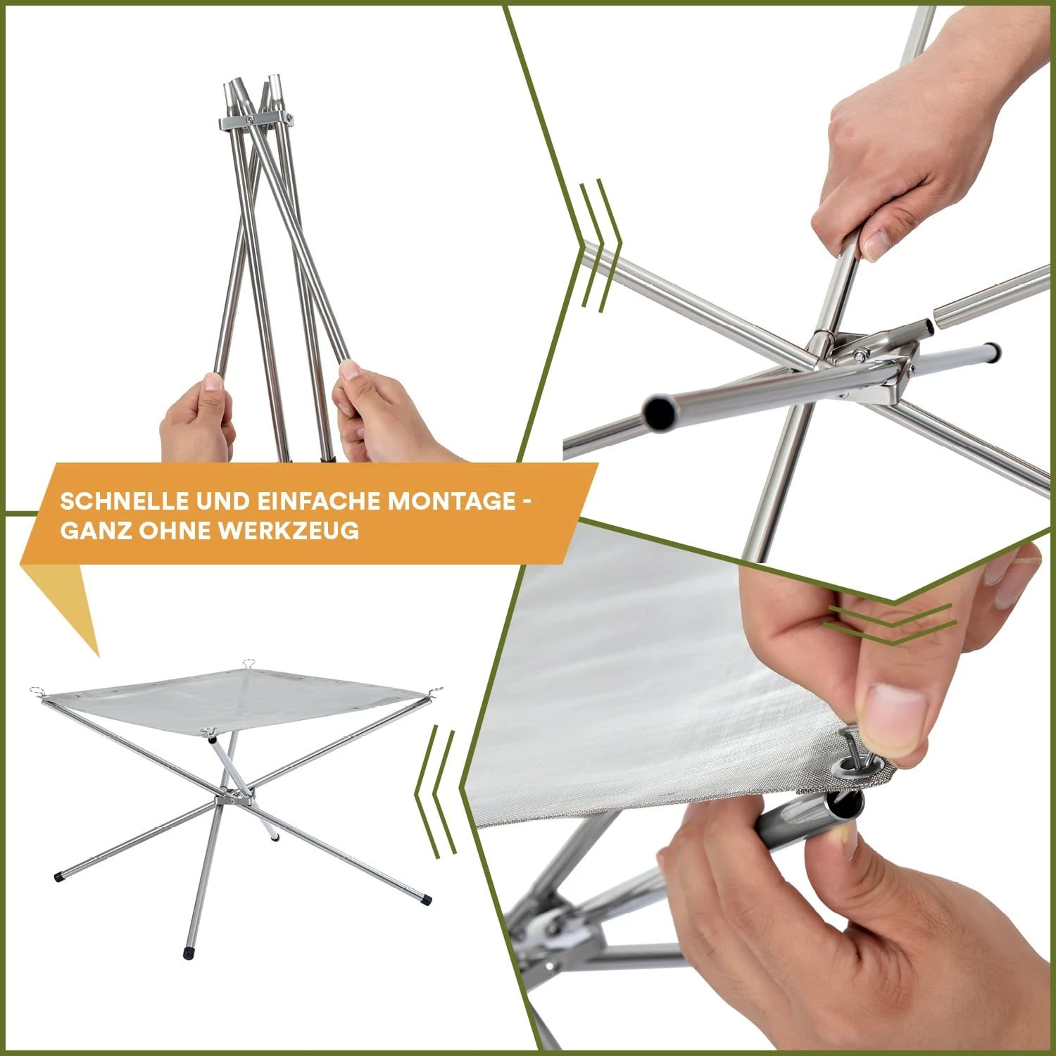 Im Handumdrehen wird das stabile Stahlrohrgestell zusammengesteckt und die hitzebeständige Stahlnetzfläche einfach mit den vier Clips sicher befestigt – ganz ohne Werkzeug. Die engmaschig gewebte Fläche verhindert, dass viel Asche oder angebrannte Holzreste auf den Boden durchfallen und hält ein Gewicht von bis zu 5 kg aus. Die vier Beine haben am unteren Ende Kunststoff-Schutzkappen, damit die Feuerschale rutschfest und sicher steht, ohne den Untergrund zu beschädigen.