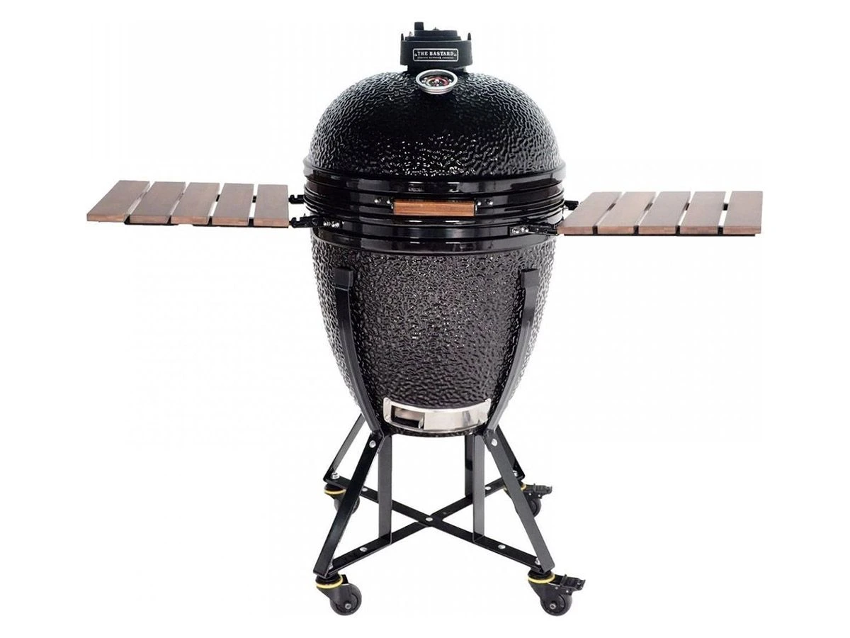 Der Grill hat Seitentische und ein stabiles Gestell. Der Deckel hat einen hitzebeständigen Griff aus Bambus. Der Grill ist in Schwarz gehalten und wird mit Holzkohle betrieben.